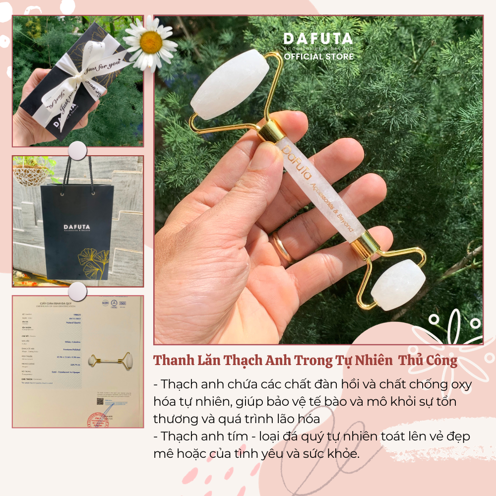 Dafuta là một thương hiệu chuyên cung cấp các sản phẩm làm đẹp và chăm sóc da từ đá tự nhiên. Thanh lăn đá thạch anh tự nhiên của Dafuta Accessories được làm từ 100% đá thạch anh tự nhiên, chất lượng đạt kiểm định PNJ Lab.