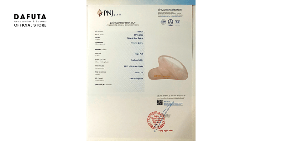 Giấy chứng nhận kiểm định PNJ Lad sản phẩm Guasha massage thạch anh hồng Dafuta